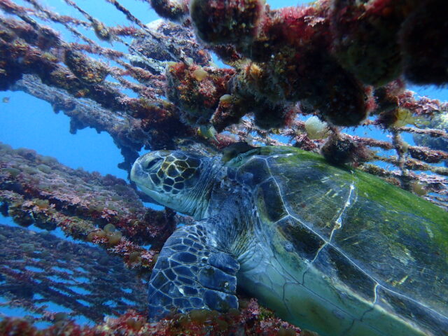 「なんかやぐらめちゃ傾いてない?」と思って上を見ると、なんとウミガメが!🐢
