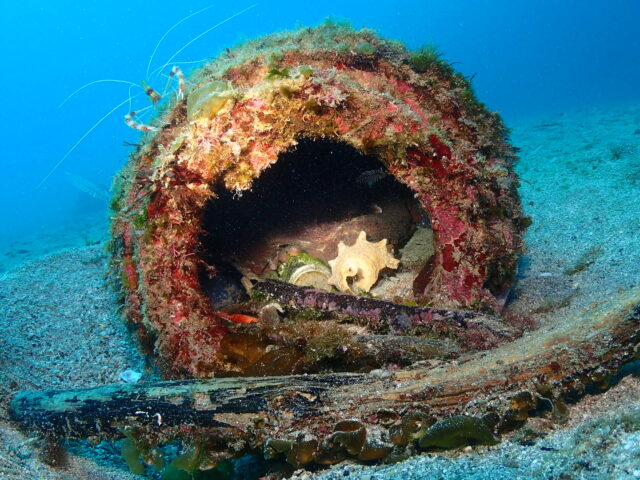 タコツボのタコを3日ぶりに見に行ったのですが、ツボのまわりを集めてきた木や貝殻、空き缶で蓋をしていました!(🐙工事途中ですが)