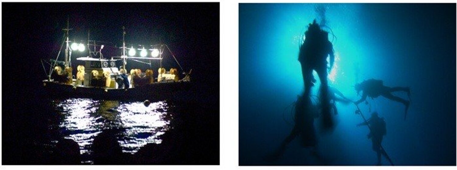 『漁火ナイト』とは漁船が沖合で集魚灯を点灯し、ダイビングエリアを明るくしてくれる特別なナイトダイビングです。
